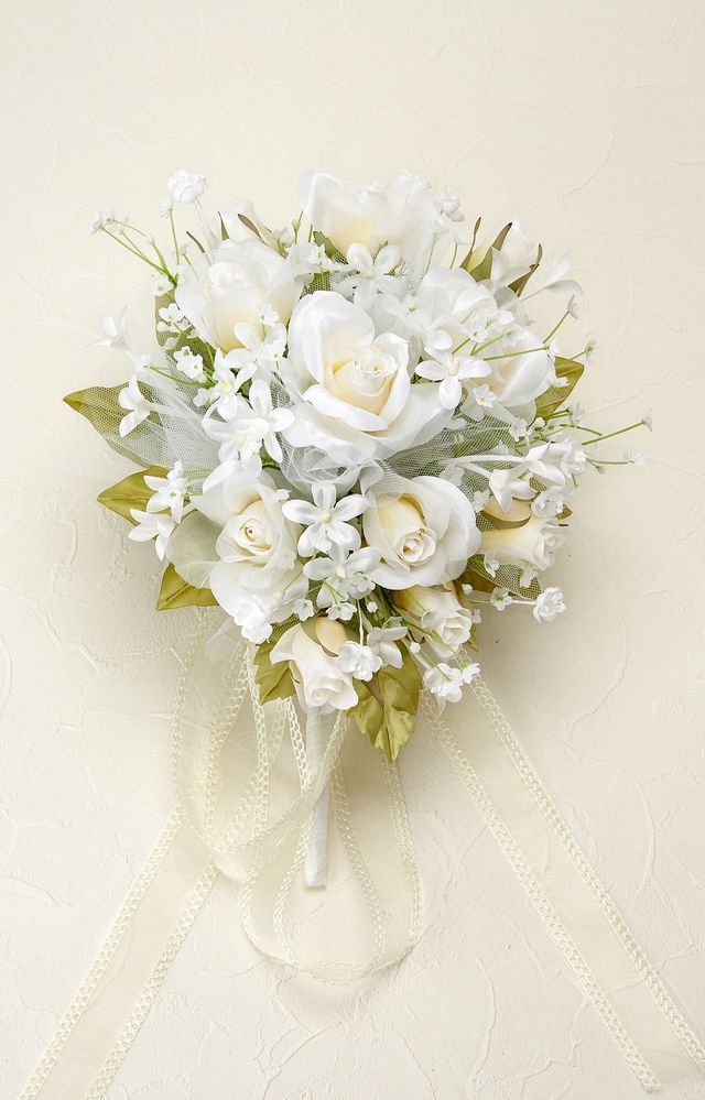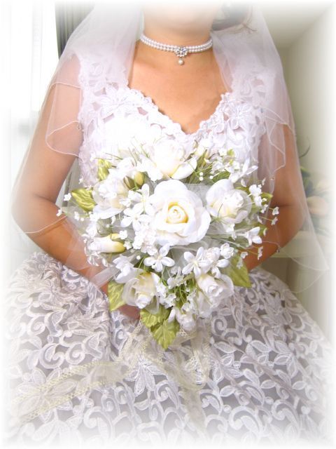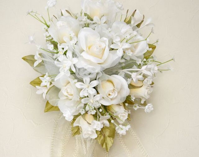 正真正銘のアートフラワー・高級造花を使用した上品なウェディングブーケ。