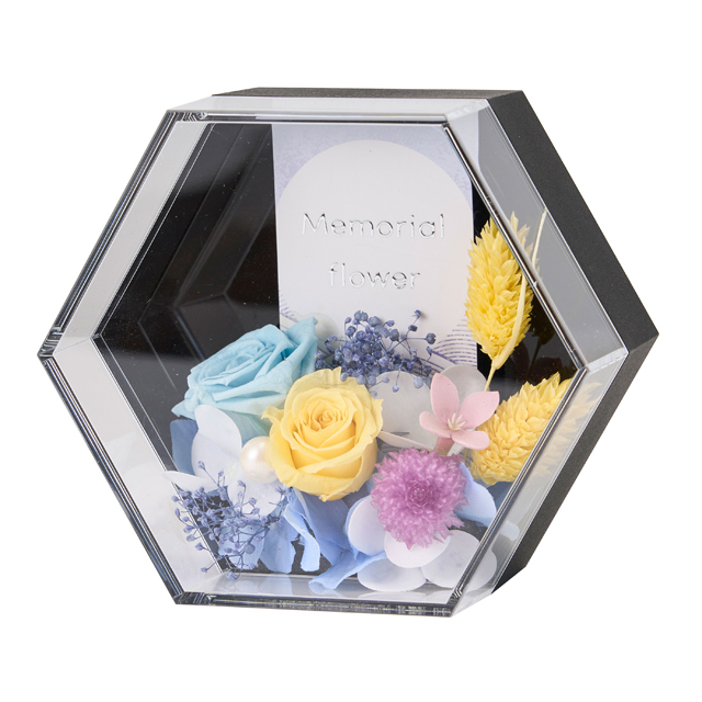 枯れることのないプリザーブドフラワーの供花。六角形のフューネラルアレンジ。