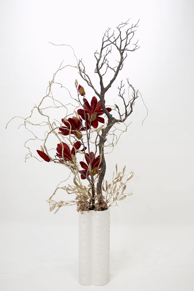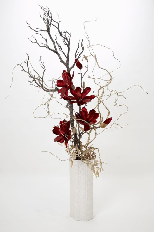 艶のある深紅のマグノリアと優雅な枝が絶妙に交差したディテールで唯一無二のデザインです。