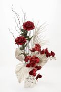 高級感あふれるこのプレミアムアレンジメントは鮮やかな赤の花々と美しいゴールド葉が絶妙なバランスのデザインです。